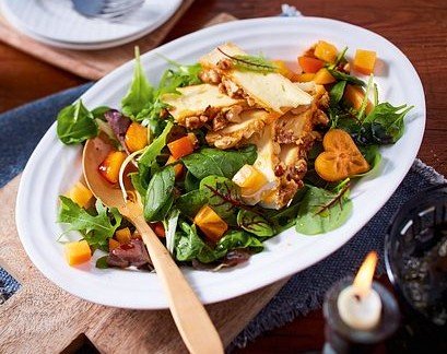 Ingrediënten: 2 eetlepels walnoten1 theelepel abrikozenjam150 gram half harde kaas (Kretschmer Kasperl)1 theelepel abrikozen of peren schnaps1 theelepel mosterd75 gram gemengde jonge sla1 scharonfruit (kaki)1 bananensjalot2 eetlepels Balsamico1 eetlepel walnootoliePeper/zout Bereidingswijze: Walnoten fijn hakken en in een droge pan roosteren. Op het laatste moment de abrikozenjam toevoegen en verdelen over de gehakte geroosterde walnoten. De…