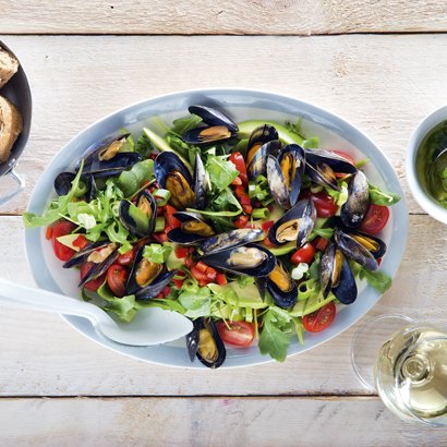 Ingrediënten: 1 kg mosselen 150 ml witte wijn 1 bosje bladselderij 1/2 rode peper 2 limoenen 5 el olijfolie extra vierge 1 teen knoflook, fijngesneden 1 eetrijpe avocado 75 g rucola 1 rode ui, in ringen Bereidingswijze: Controleer de mosselen: gooi schelpen die stuk zijn of na een ferme tik niet sluiten weg. Doe de…