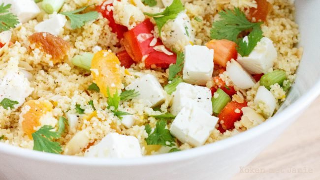 Ingrediënten: 1 limoen1 mango½ komkommer50 gr amandelen200 gr couscous150 gr feta250 gr cherrytomaatjessnuf komijnverse blaadjes munt½ groente bouillonblokje Bereidingswijze: Bereid de couscous zoals aangegeven op verpakking en voeg het bouillonblokje toe aan het water zodat de couscous een lekkere smaak krijgt. Snijd de komkommer en de mango in blokjes en de tomaatjes in vieren en…