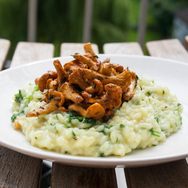 Ingrediënten: 200 gr risottorijst1 ui1 teentje knoflook250 gr Pfifferlingen (Cantharellen)600 ml warme paddenstoelen fondScheut droge witte wijnRoomboterOlijfolieKookroomVers gemalen zwarte peperZeezoutBladpeterselieVers geraspte bergkaas Bereidingswijze: Knoflook persen, ui snipperen, Pfifferlingen schoonmaken en indien nodig halveren of in kwarten snijden. Peterselie heel fijn snipperen. Paddestoelenfond verwarmen. Klont boter in een pan doen en de fijngesneden ui hierin in fruiten. Droge…