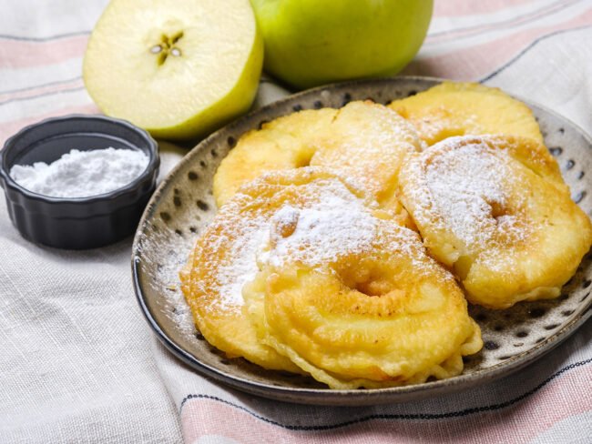 Ingrediënten: 200 gram bloem (eventueel de helft pompoenpitbloem)180 ml sekt / apfelsecco2 eieren60 gram suiker8 gram verse gist of 3 gram gedroogde gist2 jonagold appelsKokosolie om te bakkenPoedersuiker Bereidingswijze: Los de gist en de suiker op in de mousserende wijn. Doe de bloem, gistmengsel, eieren in een kom en roer goed door elkaar. Laat het…