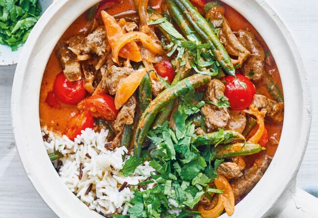 Ingrediënten: 400 gram runderlende of ezeltje1 stuks ui2 stuks knoflook tenen200 gram cherry tomaten20 gram verse gember2 eetlepels kokosvet2 eetlepels rode curry pasta100 ml groente of runderbouillon2 eetlepel tomatenpuree400 ml kokosmelk300 gram fijne boontjes1/2 bos korianderzout Bereidingswijze: Schil de ui, knoflook en gember en snijdt deze zeer fijn. De runderlende in fijne reepjes snijden en…
