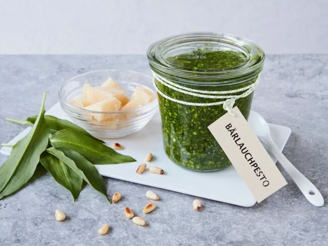 Ingrediënten: 40 gr daslook60 gr blad peterselie1 knoflookteentje100 gr pijnboompitten100 ml pompoenpitolie150-200 ml goede olijfolie extra verginezout (naar smaak)100 gr geraspte Styriano kaas of Parmazaan Bereidingswijze: Was de kruiden, droog ze en hak ze grof. Pel het knoflookteentje en hak dit fijn. Doe de kruiden, knoflook , pijnboompitten en het zout in een keukenmachine en…