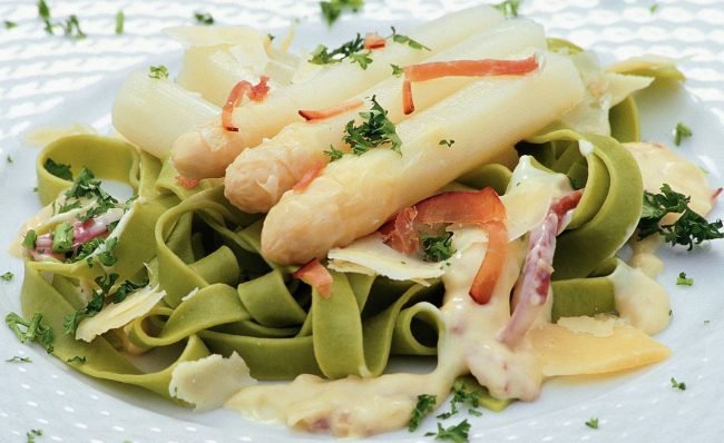 Ingrediënten: 1 kg verse witte asperges1 tl zout250 g groene tagliatelle1 ui 1 el olijfolie150 g Tiroler spek15 g verse daslook (Barlauch)125 ml kookroom50 g gerapte Parmezaanse kaas Bereidingswijze: Schil de asperges vanaf de kop met een dunschiller rondom. Snij het onderste uitgedroogde stukje (ongeveer 2 cm) ervan af. Kook de asperges met ruim water,…