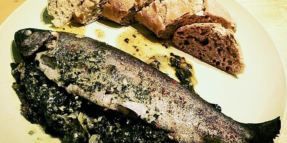 Forellen uitwassen en drogen. Daarna, van binnen en buiten, inwrijven met zout en peper. De spinazie bladeren kort blancheren. De spinazie met de knoflook en 1 eetlepel druivenpitolie vermengen en de forellen hiermee vullen.